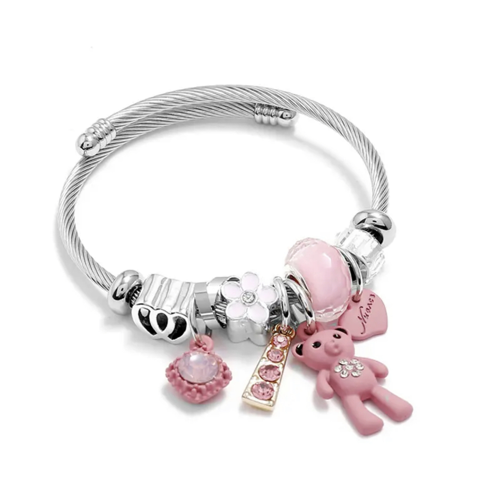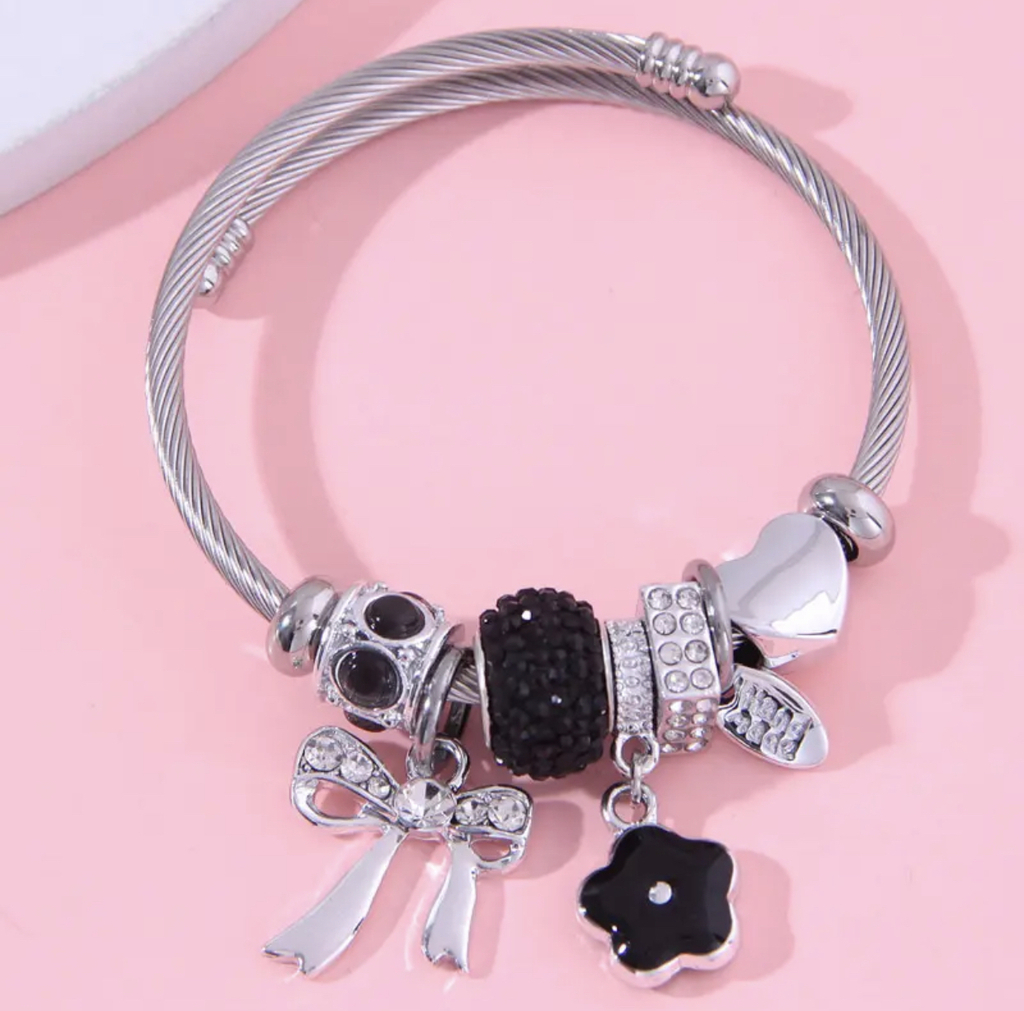 ¡Descubre nuestras lindas pulseras tipo brazalete con varios dijes ajustables! Este accesorio es el complemento perfecto para elevar tu look en cualquier ocasión.